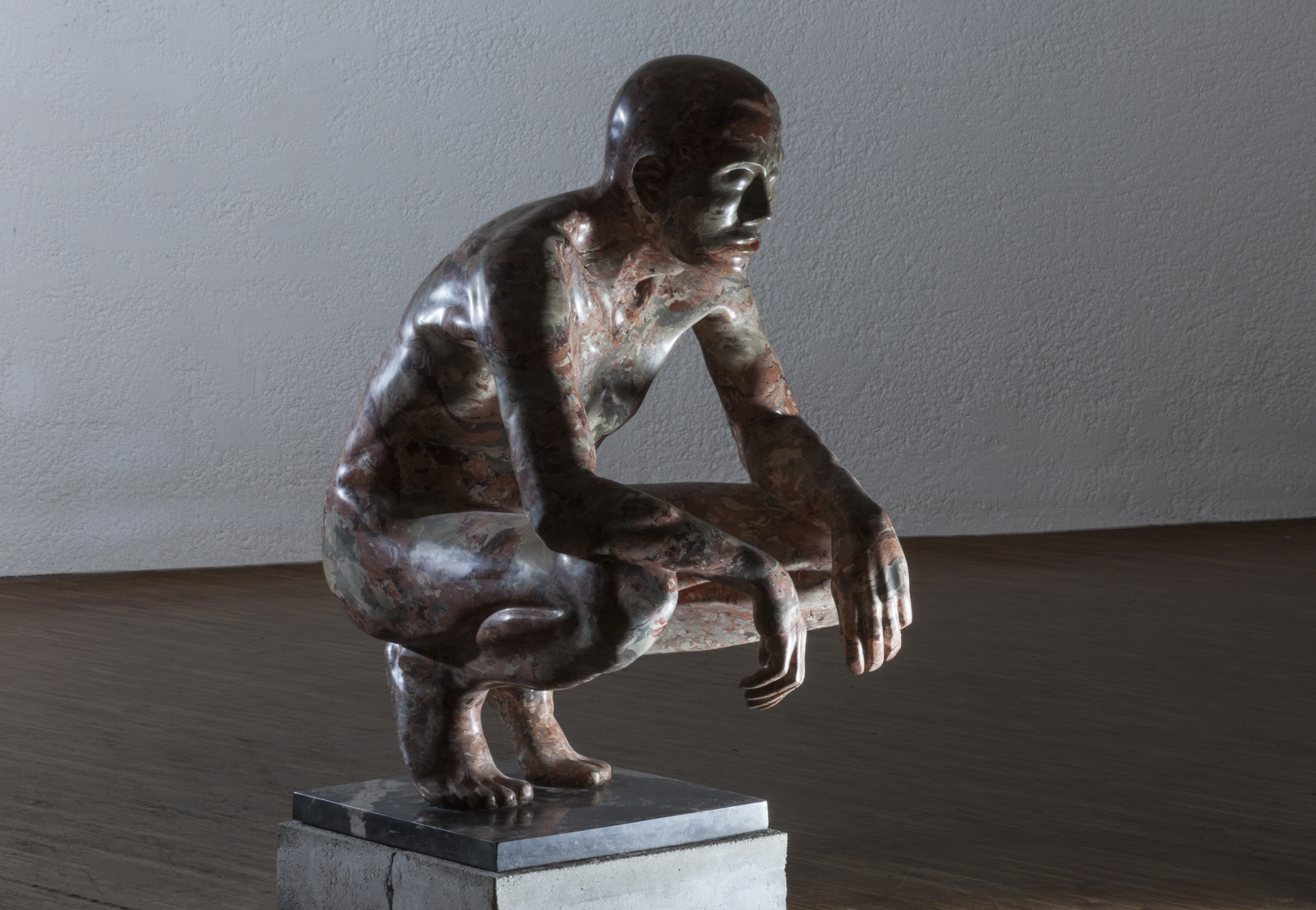 The Keupermann. Sculpture of a man squatting. life size. Scagliola