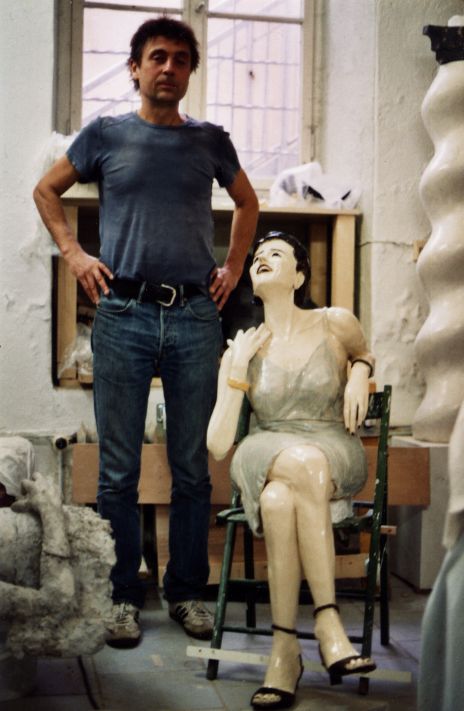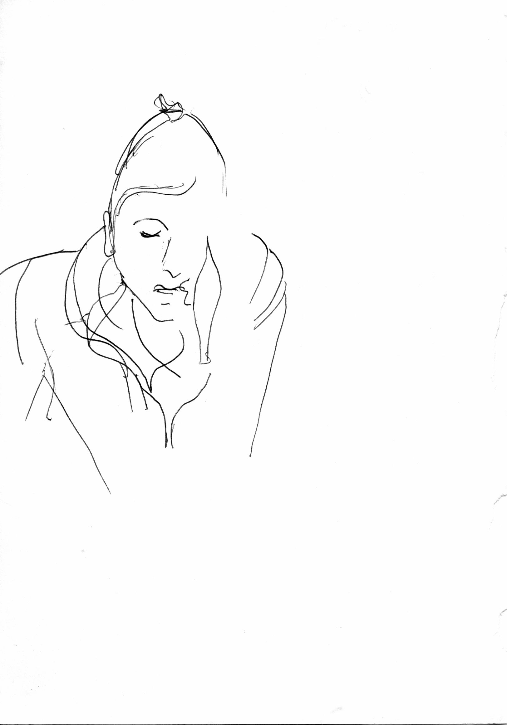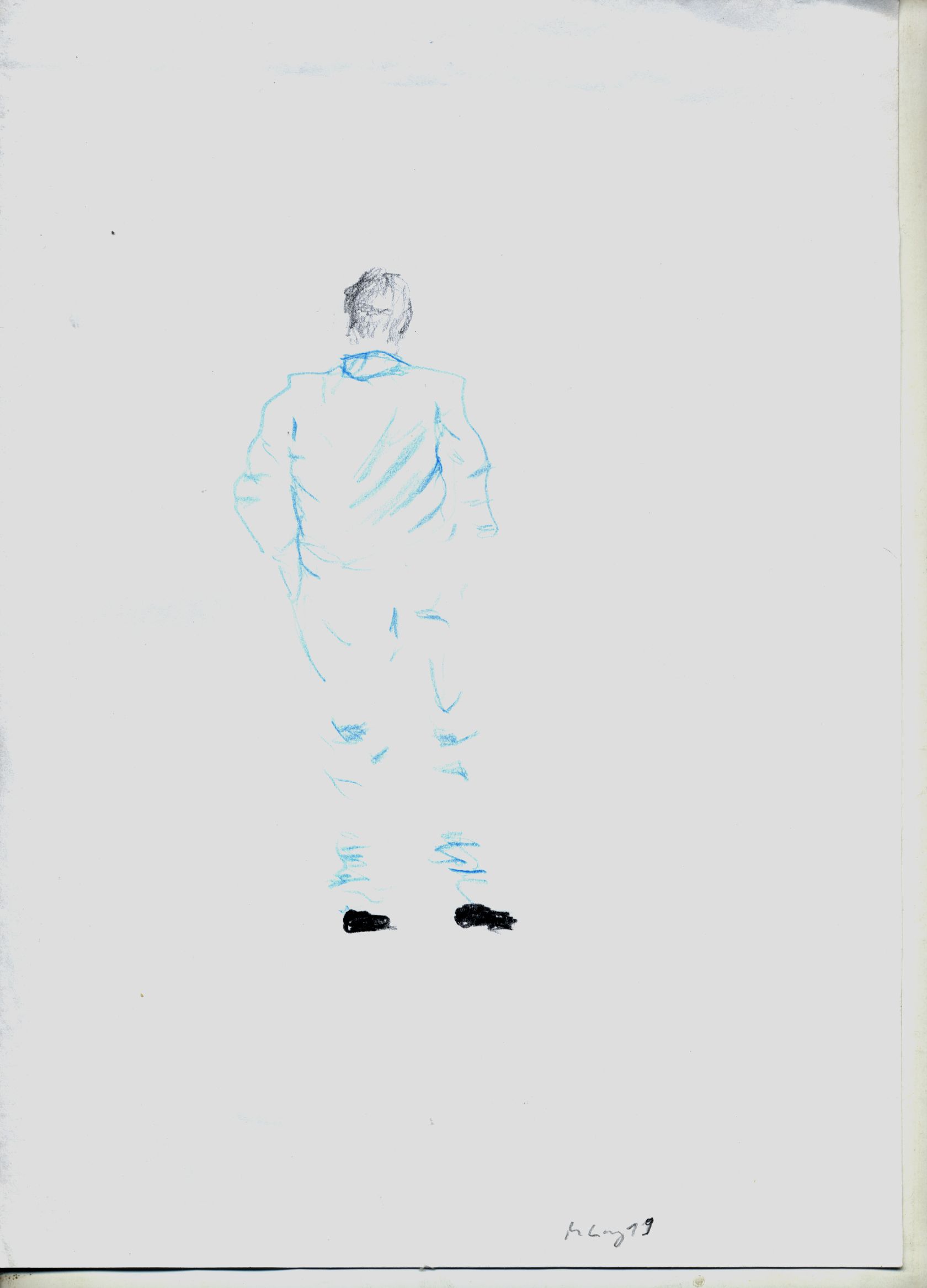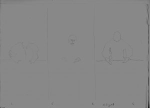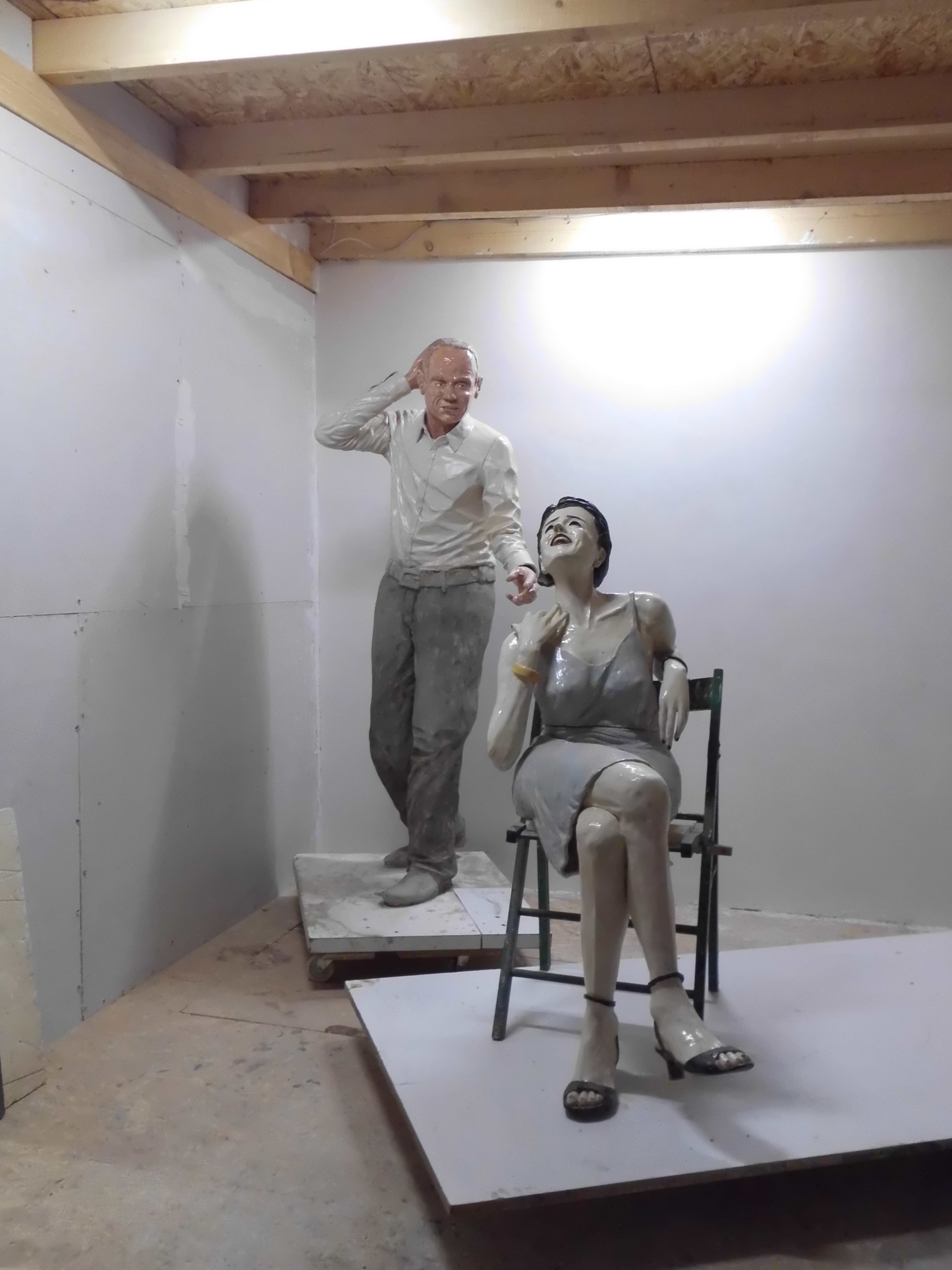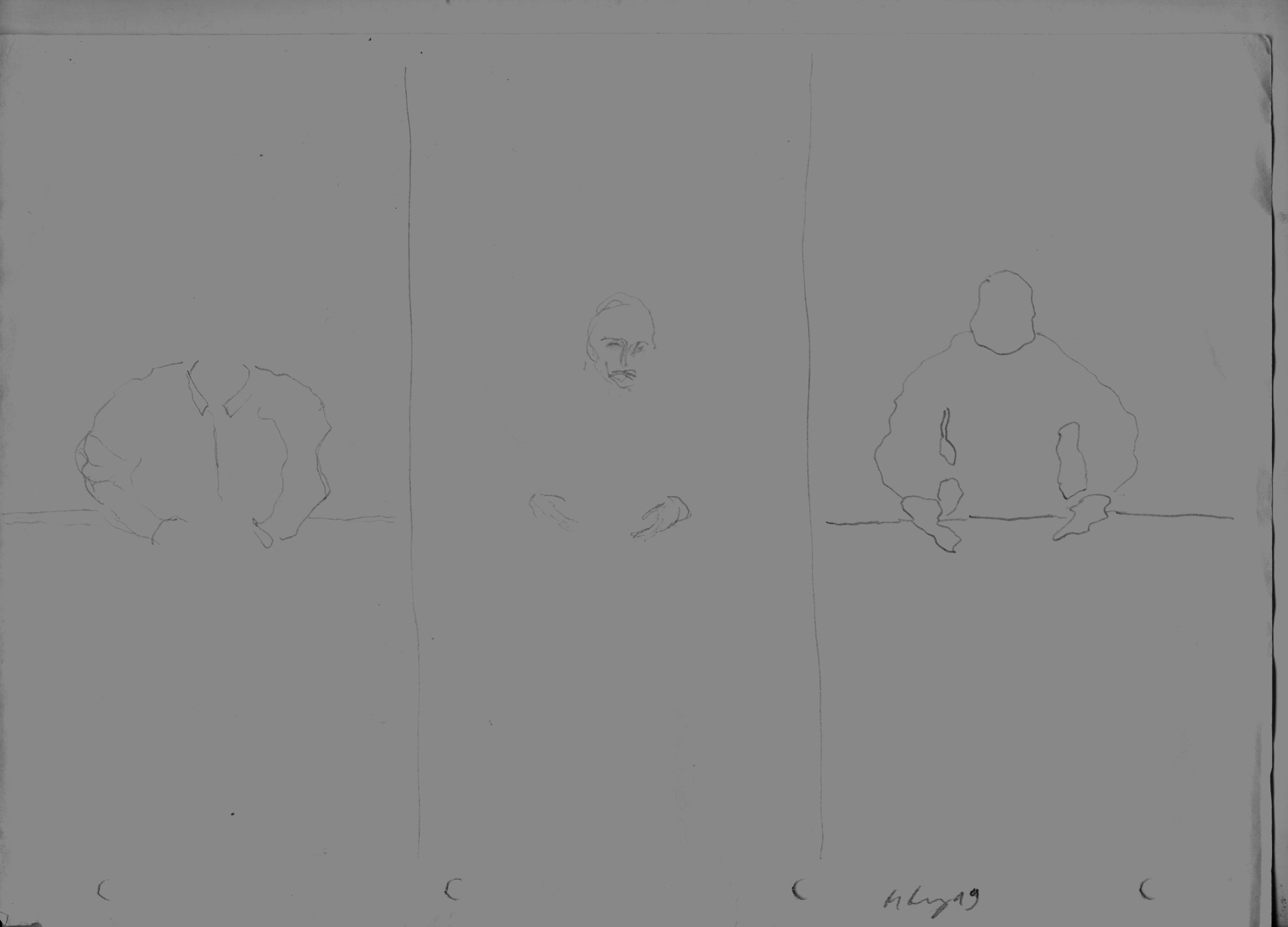 Studien zu einer 2/3 lebensgroßen Skulptur einer älteren auf einem Stuhl mit Armlehnen sitzenden Frau aus Beton und glasierter Keramik. Ich denke an eine im Hintergrund agierende Matriarchin. Wie immer verwende ich zunächst einen unverzichtbaren Arbeitshypothesen-Kopf als Steuerungszentrum für die Gestik des Körpers.